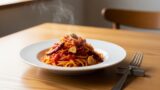 具体例:ミートソースなら、中心を少し高くして盛り、白い粉チーズは中心寄りに小さく、最後に緑をひとつまみだけ添えます。色数を増やさず、位置を決めるだけでまとまって見えます。